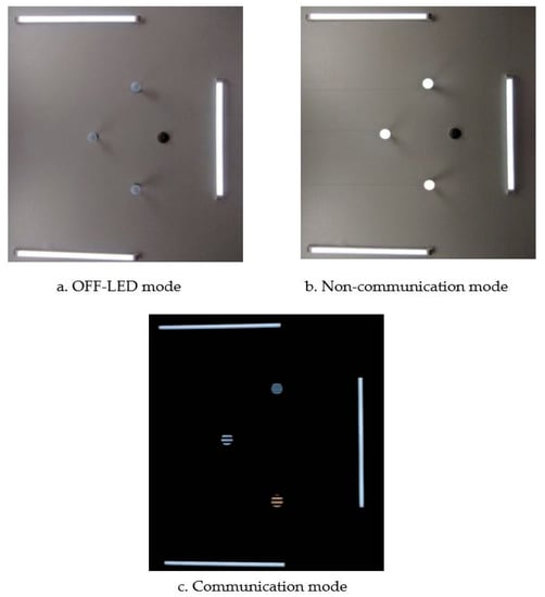 Evaluation experiment scenario. (a) Off state of LEDs scenario. (b) Illumination state of LEDs scenario. (c) Communication state of LEDs scenario.
