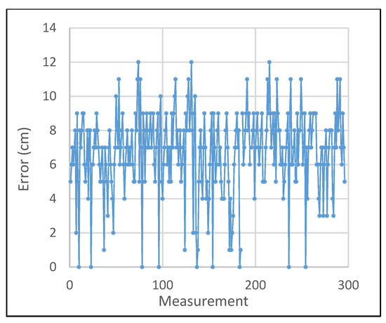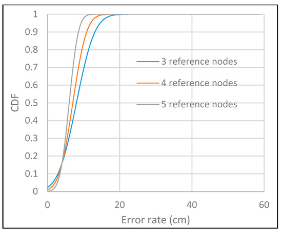 As a result of distance estimation in Section 4.2, which is controlled by camera focal length, rotation matrix angle and LED ROI, the performance evaluation of system localization, which is defined by trilateration formulas, has another factor, Gaussian distributions error of anchor distances. The performance of 300 localization estimation measurements with three reference nodes, as in the configuration scenario in Section 4.2, is shown in Figure 32. In this experiment, the vertical value, which is defined by the “z” coordinate, is calculated on the basis of the photography image sensor calculation of Section 3. The origin of the coordinate system and the direction of the axis are defined by the received reference coordinates and the image sensor coordinates. The performance accuracy of more reference coordinates with Gaussian weighing is shown in Figure 33.