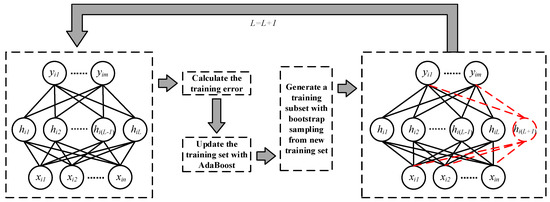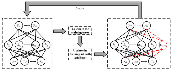 In the process of SCN training, we consider the hidden layer nodes generated by each training round as different classifiers. When SCN is in the initial state, the weights of samples are the same. When training the network, the samples’ weights are adjusted according to the training error of SCN and the recognition results of samples after each time the hidden layer node is added, and are used for the calculation of training error when the hidden layer node is added next time. Then, we repeat this step to generate more hidden layer nodes until the end of training. The flow of this method is shown in Figure 3, and the pseudo code is shown in Algorithm 2. For the sake of simplicity, we do not assign weights to the hidden layer nodes of trained network, which means all hidden layer nodes have the same weights in calculation process.