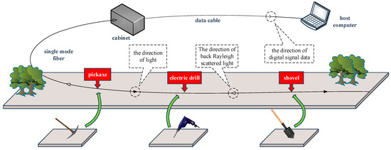 The acquisition of fiber vibration signals was completed by the OFPS developed by the authors’ laboratory, and the schematic diagram of the OFPS is shown in Figure 5. The OFPS uses Φ-OTDR to detect intrusion vibration signals. Specifically, light is emitted from the cabinet and injected into the single mode fiber. Vibrations generated on the ground change the refractive index of fiber in that place, causing the back Rayleigh scattered light to change. After the acquisition, we analyze the Rayleigh scattered light and judge the type of vibration generated on the ground according to the change.