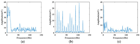 Meanwhile, the dashed boxes in Figure 6a,c show that the vibration part of a signal has a short duration and the position in the time dimension is not fixed, which makes the vibration parts of the same type of signals have different position in the time dimension. If the samples are sent directly to the classifier for training after removing DC part, it will affect the recognition of classifier. FFT transforms the signal from time domain to frequency domain, which ignores the information of time domain, and unifies the vibration signals of same type. Therefore, we perform 128-point FFT on vibration signals. Figure 7 shows the result of performing FFT on the signals shown in Figure 6.
