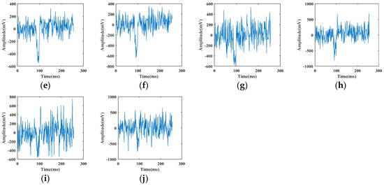 Pickaxe signal superimposed with white Gaussian noise according to Equation (9): (a) ; (b) ; (c) ; (d) ; (e) ; (f) ; (g) ; (h) ; (i) ; (j) .
