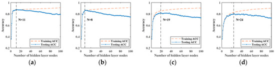 From Figure 1, we can see that the input is , and the output is , , where N is the number of training samples, n is the dimension of sample’s input, m is the dimension of sample’s output. Meanwhile, we define the input weight matrix as , the bias vector as , where L is the number of hidden layer nodes. Then, we calculate the output of hidden layer nodes of network according to the input of network, input weight matrix and bias vector. Herein, the output of the Lth hidden layer node is expressed as