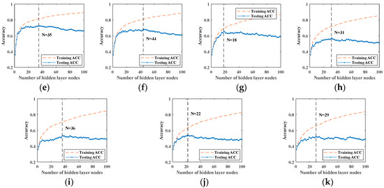 Original SCN’s training and testing accuracy for signals superimposed by white Gaussian noise: (a) ; (b) ; (c) ; (d) ; (e) ; (f) ; (g) ; (h) ; (i) ; (j) ; (k) .