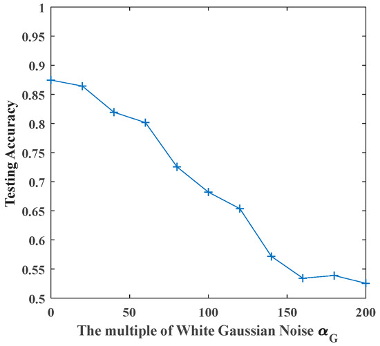 From Figure 11, we can see that the recognition accuracy of original SCN decreases with the increase of noise’s amplitude. By observing the recognition effect of signals with equal multiple of noises, it can be seen that different noises have different degrees of interference with signals. For white Gaussian noise, testing accuracy decreases from 0.8746 of noiseless signals to 0.5254 when the multiple of noises is 200; For white uniform noise, the testing accuracy decreases from 0.8582 of noiseless signals to 0.4388 when the multiple of noises is 200. For Rayleigh distributed noise and exponentially distributed noise, the testing accuracy decreases from 0.8657 and 0.8463 with the noiseless signal to 0.6045 and 0.6642 when the multiple of noises is 200.