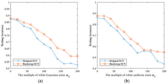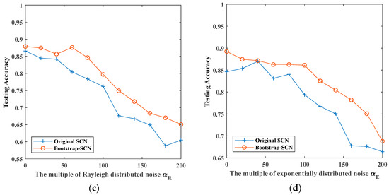 The maximum testing accuracy of original SCN and Bootstrap-SCN with different noises: (a) white Gaussian noise; (b) white uniform noise; (c) Rayleigh distributed noise; (d) exponentially distributed noise.