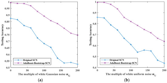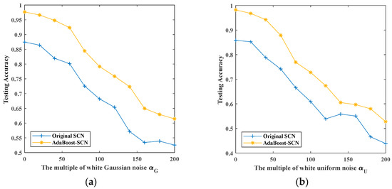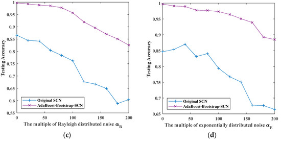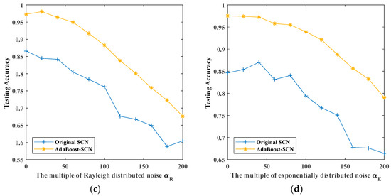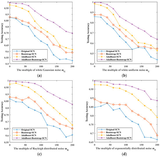 The maximum testing accuracy of original SCN and AdaBoost-SCN with different noises: (a) white Gaussian noise; (b) white uniform noise; (c) Rayleigh distributed noise; (d) exponentially distributed noise.