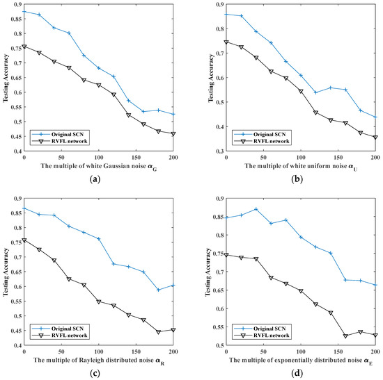 The maximum testing accuracy of original SCN and RVFL network with different noises: (a) white Gaussian noise; (b) white uniform noise; (c) Rayleigh distributed noise; (d) exponentially distributed noise.