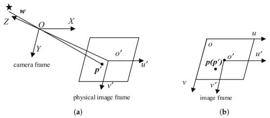 Let be an arbitrary unit star vector [16] with respect to the camera reference frame, and its projection on the image frame is . The perspective projection relationship between w and p can be represented as [22,24]: