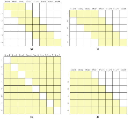 Concerning Equation (28), if all the stars in the FOV are used to calculate the singular values, it is easy to find that there are only three rows in the Jacobian matrix . The order of is less than the number of the state parameters, so the observability of the estimator is bad. In order to solve this problem, the stars should be put into several groups, such that the order of can satisfy the estimator. There are many different combinations of the stars, however; how to choose the proper combination is discussed below.