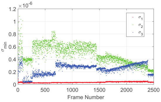 During the research, one unanticipated finding was that the sensitivities of the three singular values were quite different, as shown in Figure 4: , , and are three singular values with descending order, and the observability of is worse than and . Thus, we should consider whether all three singular values are suitable for the estimation of the camera parameters, and we discuss this question with respect to the physical interpretation of the SVD of the star vector matrix W (see Figure 5).