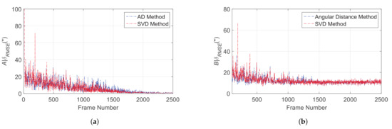 It is interesting that, under Criterion A, the performance of the SVD method was close to, or even better than, the AD method, and the SVD method was more stable. However, under Criterion B, the performance of the SVD method was always worse than the AD method. This phenomenon occurred because the AD method uses the angular distance as the object of optimization estimation, so the comprehensive calibration results, considering both the camera parameters and the centroid noise, were better. It must also be mentioned that the estimation of the attitude of the star sensor was based on the star vector itself, rather than the angular distance, such that the accuracy of the camera parameters was more important; namely, Criterion A could better reflect the calibration effect than Criterion B. Therefore, the accuracy of the SVD method was as good as the AD method. The convergence rates of the two methods were also similar; as shown in Figure 6, the RMSE was calculated between the nominal angular distances and the angular distances that were obtained by the back-projection with calibrated parameters, which was the result of Group 2. Nevertheless, the elapsed time of the SVD method was significantly shorter than the AD method, especially for the case with a large number of stars in the FOV. Concerning Group 1, the calculation speed of the SVD method was improved by 94.48%, compared to the AD method.