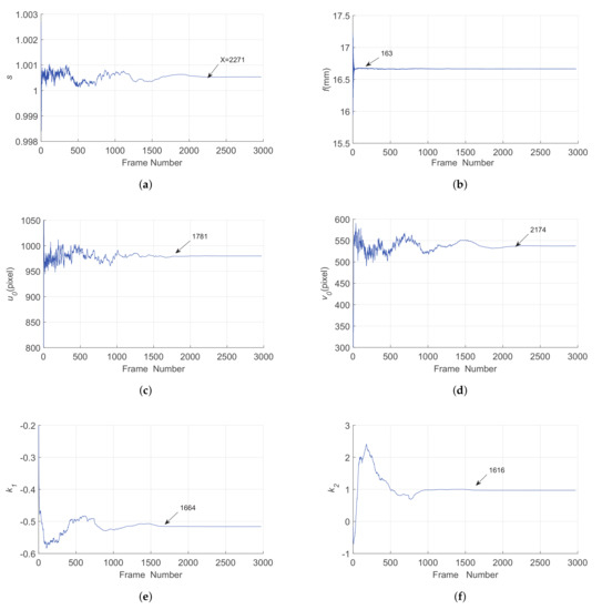 The initial values of the parameters were the same as in the simulation. The estimation results of the parameters are shown in Figure 8, where the arrows in the images represent the points of convergence, and the order of the convergence of the parameters was f, , , , , and then s. With about 2200 images, the whole estimation was convergent; was 8.33″, and was 0.803″. We found that the performance in the field experiment was better than the simulation. This was because Criterion B employed the noisy simulation data, and this noise might affect the results; namely, it means the centroid errors in the field experiment were smaller than the assumption in the simulation. Therefore, the SVD method can perform well in the on-orbit calibration of a star sensor.
