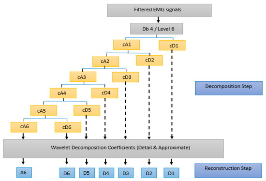 - The EMG signals were decomposed into seven sub-bands, one approximate coefficient (cA6), and six detail coefficients (cD1, …, cD6).