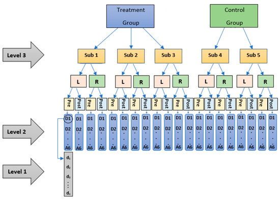 - A decomposition process was applied using wavelet transforms. Each WT sub-band was assumed to represent the firing rate of a group of MUs. Also, it was assumed that the RP of each individual sub-band reflects the level of activity for these MUs. Thus, increases or decreases in RP may characterize the recruitment pattern process of the MUs through different conditions of the experiment. The filtered EMG signals were broken down into seven frequency sub-bands using the WT. The discrete wavelet transforms (DWT) was selected for this work because it has non-redundant results, and it required less computational time and costs [42,43]. A Daubechies mother wavelet of fourth order ‘db4′ was used due to its similarity to the triphasic pattern of the motor unit action potential [44]. Consistent with the analysis of other bio-signals, DWT decomposition was performed using six levels [43,45,46,47,48]. The wavelet analysis was performed in two steps, as presented in Figure 2: