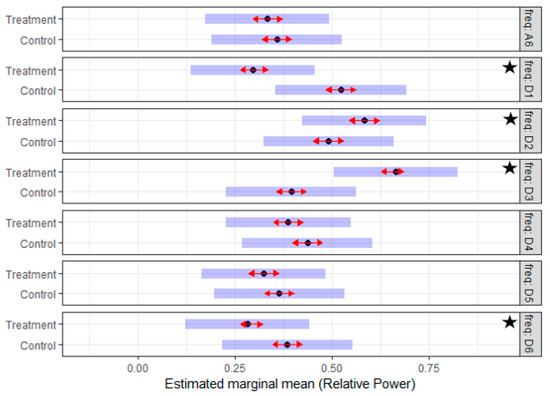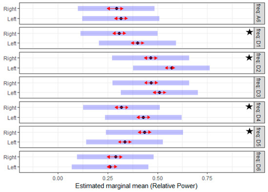 - To evaluate the changes in EMG sub-bands during different phases of the experiment, these changes were characterized using the RP. The probabilistic distribution of the spectral power was quantified by calculating the relative power of each spectral component [49]. To obtain the RP, firstly the power spectral density was determined for each reconstructed EMG sub-band signal. Then, the RP for each individual sub-band was calculated using the following formula [50]:where:
