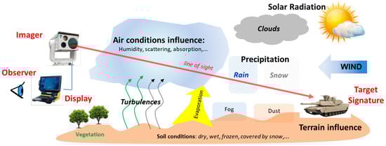 Thermal imaging devices’ image formation process depends on many influencing factors, as illustrated in Figure 1 and listed in Table 1. The assessment of all listed influences is not possible with sufficient accuracy, especially in field conditions. That could lead to inaccuracy in the thermal imager range predictions.