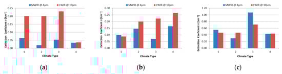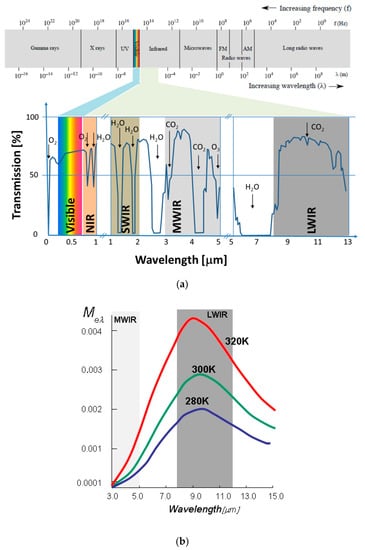 Thermal imagers are designed to use target radiation in the infrared part of the spectrum using so-called atmospheric transmission windows (either middle-wave infrared (MWIR) or long-wave infrared (LWIR)), as illustrated in Figure 3a. The spectral sensitivity band selection is important and has influence on the imager range because of the differences in scene IR signature and atmospheric transmission differences, as illustrated in Figure 3b and summarized in Table 2.