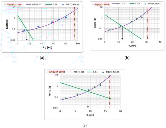 where f is the spatial frequency; SNR is the target signal to noise ratio; MTF(f) is the thermal imager total modulation transfer function; NETD is the noise equivalent temperature difference; and F (f, DP) is the thermal imager-related design function depending on system design parameters (DP). This MRTD model tends to be optimistic at low spatial frequencies and pessimistic at higher spatial frequencies, but is a thermal imager model that can be proven through laboratory measurements and used for thermal imager range performance estimation [].