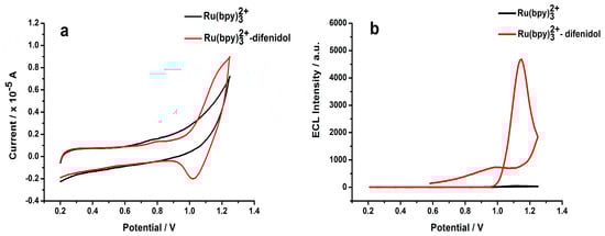 As shown in Figure 4a, the oxidation peak was identified at +1.0 V and increased when difenidol hydrochloride was added to the electrolyte solution. This was due to the synergetic effect of difenidol hydrochloride on the oxidation–reduction reactions of Ru(bpy)32+ [42], by which the tertiary amino of difenidol was oxidized into radical cations.