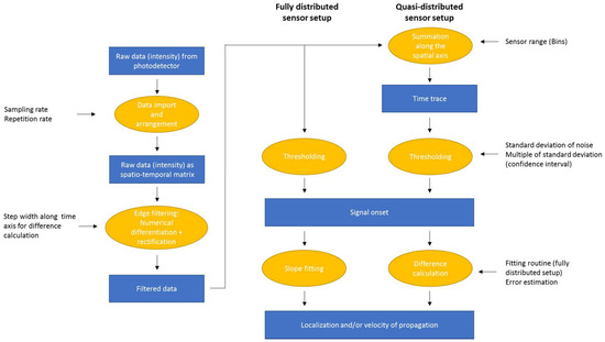 After preparing data in this way, edges were automatically detected by thresholding the signal intensity within a certain bin or summed up intensity within a range of bins with respect to the noise level. The threshold level was set as a multiple of the standard deviation of the noise. From the signal onsets detected in this way the propagation velocity and/or localization of events was deduced by either slope fitting in the case of a fully distributed setup, or by calculation of the runtime difference for the quasi-distributed setup. The whole process of data analysis is summarized in Figure 1.