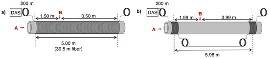 For laboratory-scale tests a stainless-steel pipe of 6.25 m length, inner diameter of 40.7 mm and outer diameter of 48.3 mm was simultaneously equipped with two separate sensor configurations. The pipe was open on both ends. Each configuration could be connected to the C-OTDR system independently. They are schematically depicted in Figure 2.