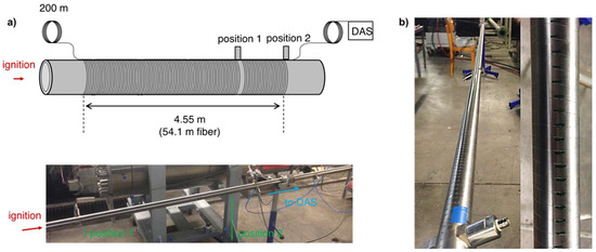 Figure 3a gives a schematic overview of the instrumented pipe. A continuous configuration of optical fiber was chosen similar to configuration 1 as described above to ensure fully distributed measurements, which are a prerequisite to track accelerated pressure waves. Fiber pitch was 1 cm yielding a total applied fiber length of 54 m on a stretch of 4.55 m of the pipe (detail photo shown in Figure 3b). As a reference, two piezoelectric pressure transducers were placed in the sensor penetrations. Their positions were one meter apart from each other at the end of the region monitored by the optical fiber (Figure 3a).