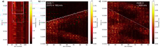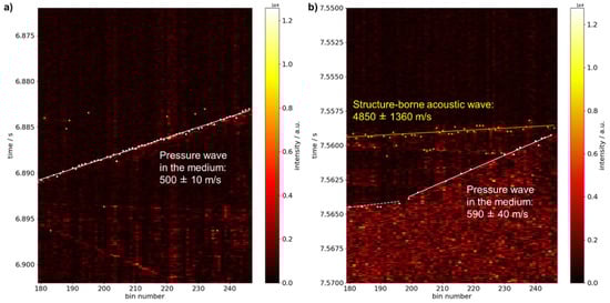 Moreover, propagation of the pressure wave along the observed length of pipe is non-linear and may be roughly divided into two linear regions with different slopes. In the first region as seen from the place of ignition (on the right in Figure 10b, 197–247 bins) a velocity of (590 ± 40 m/s) is calculated from signal onsets (white points) and linear fitting (white solid line). The second region (on the left, 179–196 bins) exhibits a considerably smaller slope corresponding to a much higher propagation velocity of the pressure wave. As the number of position bins in the region is rather low, linear fitting is not applicable here.