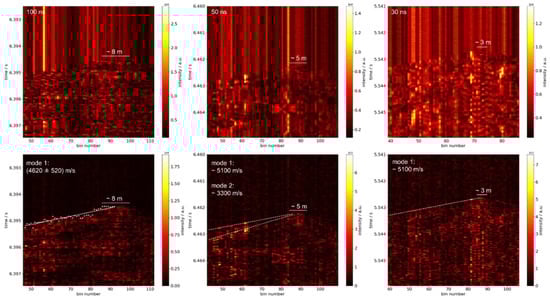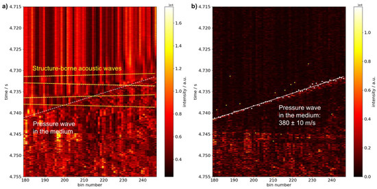 First, a higher acoustic intensity is noticed leading to much more pronounced signal features of the structure-borne waves (marked in yellow) in the filtered data so that automatic signal evaluation is possible—albeit with a rather high uncertainty. The deduced velocity amounts to (4850 ± 1360) m/s in agreement with former results.