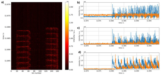 As a first test of the ability of the system to localize short mechanical impacts on the pipe, the pipe was hit on the front face (Figure 2, position A) while a continuous measurement by C-OTDR was carried out using the fully distributed sensor configuration 1. A pulse length of 100 ns was chosen to achieve high signal intensity at acceptable spatial resolution. Figure 4a shows a temporal excerpt of the acquired raw data. Signal intensity is plotted as a function of time and bin number representing the position along the optical fiber. The signal appears as a zigzag pattern between bins 19 and 101. Considering, the spatial resolution of 10 m along the optical fiber for the chosen pulse length of 100 ns, data outside the region between bins 28 and 92 was discarded for further evaluation. The remaining range of 64 bins or corresponds well to the region of fiber which is in close contact to the pipe surface due to the helical wrapping. No signal is visible outside this fiber region, that could be attributed to the mechanical impact. Therefore, the influence of air-borne sound caused by the impact can be neglected and the pattern observed in Figure 4 is understood as the structure-borne acoustic wave traveling in the pipe material, which is reflected from both ends of the pipe segment. It extends the full length of the pipe without any obvious damping and can be observed for several seconds. This underlines the necessity to capture the propagation of the acoustic wave at the onset of the signal on a fast time-scale in order achieve a localization of the event on the pipe.