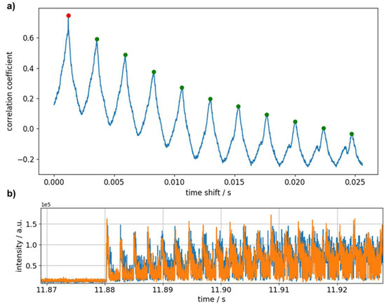 (a) Correlation function for the two time traces after filtering and spatial averaging recorded by the sensor closer to (blue) and further away (orange) from the point of impact. Absolute (red) and relative (red and green) maxima of the correlation are marked. (b) Corresponding time traces shifted according to maximum correlation.