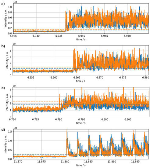 If excitation takes place on the side of the pipe (Figure 2, position B) the periodicity seen above is not as expressed, which may again be attributed to blurring caused by signal crossings and to a less effective excitation of the acoustic mode resulting in an overall lower signal-to-noise ratio. Therefore, signal onset is used for the determination of velocities. Setting appropriate thresholds, we find (5710 ± 210) m/s, (5510 ± 200) m/s, and (5510 ± 200) m/s using optical pulse lengths of 100 ns, 50 ns, and 30 ns, respectively. Time traces shifted with respect to signal onset are shown together with the ones obtained after excitation in position A (pulse length: 50 ns) in Figure 8.