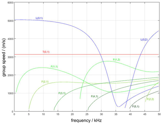 Dispersion curves of group speeds for different acoustic modes propagating in cylindrical waveguides determined by numerical simulation for the given pipe geometry and material properties.