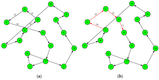 For example, the distance of the link C-D-E-F-G in Figure 2a is 22 + 22 + 33 + 63 = 140. However, if the link changes to C-F-E-D-G shown as Figure 2b, the cross edges CD and FG can be removed. The distance changes to 29 + 33 + 22 + 17 = 101. A cross edge removing method proposed in [24] requires great computation overhead as the number of vertices increases.