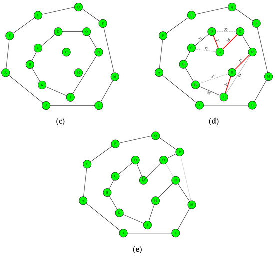 As the example in the Figure 1d, all vertices in Ω2 are initially added into set Π. Vertex G is one of the remaining vertices in Ψ and the closest vertex in set Π is D. The vertices before and after G are C and O respectively. The distance cost for inserting G between D and O is 27 and the cost is 29 if G is inserted between C and D. According to (7), vertex G is inserted into the circle Π at the position between C and O. The insertion position of vertex H is similar and the position is between I and N.
