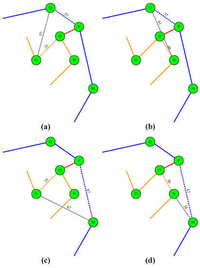 As the example in the Figure 1e, the edge , where O ⊂ Π and P ⊂ Ω1, with distance cost being 22 is selected as the first edge to merge these two circles. The four possible combinations of the other merge edges are given as the Figure 2a–d. In the case of 2a, these two circles are merged by adding edges and and removing edges and . The distance cost is (22 + 57) − (35 + 37) = 7. The other cases in Figure 2c,d have distance costs being 16, −13, and −40. Finally, the case in Figure 2d is selected to merge these two circles because the distance cost is minimal.