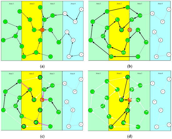 A little example of the CMRP algorithm is shown in Figure 3. There are 24 sensors deployed within the ROI, and the sink is placed at the center of this area shown as Figure 3a. The coverage of sunlight shifts from area1 to area4 periodically. The current sunlight coverage is at area2. Therefore, the sensors located within the area2 are type1 sensors. The sensors located within area 1 and 3 are the type2 sensors, and the type3 sensors are those located within the area 4. Sensors and the sink are treated as the vertices on the plane. The minimum spanning tree of these vertices rooted at the sink is constructed shown as Figure 3a. The type1 and type2 sensors are merged to build the circular chain. The type1 sensor G is the first leader of this chain. Figure 3b shows the corresponding data propagating target of each sensor based on the chain-based routing protocol.
