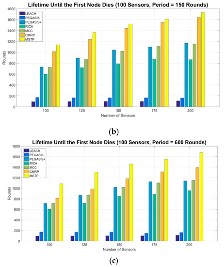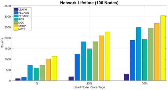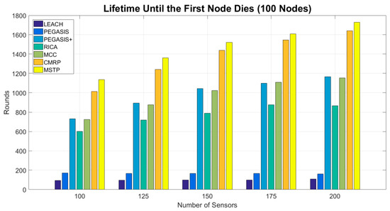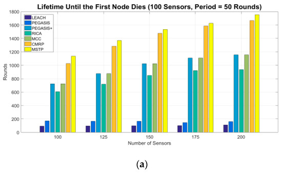 Figure 4 shows the lifetime until the first node die. The numbers of rounds of the LEACH and PEGASIS methods are lower than 200. The LEACH spends too much energy on long-distance data transmission. The original PEGASIS uses a bad chaining methodology that causes it to introduce worse results. The PEGASIS+ is applying the proposed MCC method to chain the sensors. This chain is created by linking the sensors into a circle at first and then breaks the longest edge. The results become better explicitly. The results of the ring-based method RICA [24] is better than original PEGASIS because it has a better chaining mechanism. When the ring-based method RICA applies the proposed MCC mechanism to chain the sensors into a circle, denoted as MCC, the number of operation rounds increases about 20–30%. A well adjacency methodology explicitly reduces the data transmission distance so that sensors can save their energy and the network has a longer operation time. Among all evaluated methods, the MSTP method has the longest lifetime. MSTP selects the shortest adjacent neighbor to propagate data so that every sensor can minimize the energy consumption used on propagating data to its next hop.
