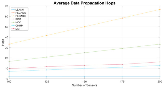 The average number of data propagation hops evaluates whether a method can quickly deliver the data to the target through by using fewer numbers of relay processing. The average data propagation delay indicates the delay time to propagation data to the sink. Note that propagation hops does not imply short propagation delay. If sensors have the same target to receive data, they need to be queued to send data. Therefore, a routing method with fewer numbers of propagation hops does not imply it will have shorter propagation delay. Propagation delay can be reduced if multiple sensors can propagate their data simultaneously.
