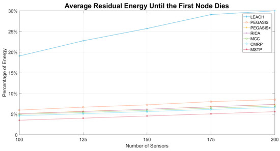 Figure 7 shows the average remaining energy of the sensors until the first node dies. Sensors in the LEACH method have fewer propagation hops and have extremely unbalanced energy consumption. The average residual energy of the sensors is more than 18–30%. While the number of sensors increases, the average residual energy of sensors grows. It indicates that sensors do not efficiently share the data propagation overhead.