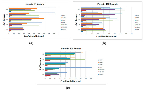 Figure 9 shows the impact of the sunlight coverage period. Three period {600, 150, 50} rounds are simulated shown in Figure 9a–c, respectively. When the period shortens, the numbers of operation rounds of all methods slightly increases except the CMRP. The improving rate of the operation rounds is no more than 5%. However, the improving rate of the CMRP is ranged from 15–29%. The CMRP adapts the routing mechanism according to the charging status of the sensors. The intelligent adapting makes it suitable for application in rechargeable wireless sensor networks. The results of the confidential interval with alpha = 0.95 of Figure 9a–c are shown in Figure 10a–c. Most of the results have no more than 0.8% error.
