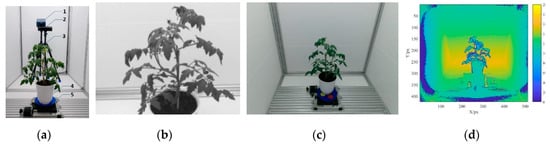 The multispectral 3D imaging system established in this study for greenhouse tomato plants consisted of an imaging room, a light source, an SOC710 hyperspectral imager, a Kinect sensor, an electric rotary table, a controller, and a graphics workstation (Figure 1a). The imaging room was made from aluminum profiles and its inner dimensions measured 180 (length) × 120 (width) × 160 cm (height); the interior sidewalls and floor were covered with white matte film. The power of the light source was 150 W, the response wavebands ranged from 380 to 2200 nm, and the intensity of the light source was stepless adjustable. The SOC710 hyperspectral imager had a built-in scanning system and covered a spectral range from 400 to 1000 nm for 128 wavebands; the image resolution was 696 × 510 px and the wavebands for imaging were selectable. The Kinect sensor (Microsoft Kinect 2.0) consisted of a color camera and a depth sensor. The RGB and depth images had resolutions of 1920 × 1080 px and 512 × 424 px, respectively; the frame rate was 30 fps, and the detection range was 0.50–4.50 m. The electric rotary table disc, which was 20.00 cm in diameter and was driven by a 57BYG stepper motor, could be rotated over a 360° range with a resolution of 0.0005° and a positioning precision of 0.01°. The controller used was an HW-36MT-3PG programmable controller with 20 input interfaces, 16 output interfaces, an RS232C communication interface, and a built-in 3-channel, 100 kHz, high-speed pulse output. The graphics workstation processor was an Intel (R) Xeon (R) E-2176M CPU @2.70 GHz with a 32G memory capacity and an NVIDIA Quadro P600 4G graphics card. Visual Studio 2015 and MATLAB 2017a were jointly used to program the system control.