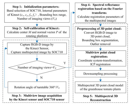 Figure 2 presents a flowchart of the multispectral 3D imaging system for greenhouse tomato plants. Step 1 was used to initialize the system parameters and included the selection of the characteristic wavebands: Blue, Green, Red, Red-edge, and Near infrared (Nir), by the SOC710 hyperspectral imager and the determination of (i) the intrinsic parameters for the Kinect sensor, such as the principal point coordinates (cx, cy) and focal length (fx, fy), (ii) the area of the plant region of interest (ROI) (row, width, and height), and (iii) the number of AOVs (VN) required for plant 3D modeling. Step 2 was the Kinect pose estimation and self-calibration process. RGB-D images of the electric rotary table surface were taken at two or more AOVs and used to determine the point cloud coordinates of the yellow and red calibration stickers on the table surface at different AOVs according to the color threshold value. Subsequently, the center points of the two calibration stickers were identified to calculate the center coordinates and the normal vector of the rotation axis on the rotary table. Step 3 was spectral reflectance registration and calibration. The registration transformation matrix was calculated on the basis of the Fourier transform, then the spectral images obtained by the SOC710 imager were registered to the RGB image coordinate system obtained by the Kinect sensor. The spectral reflectance of multiple channels was mapped to the corresponding depth coordinates by using the same transformation parameters. Step 4 was the acquisition of the plant multiview RGB-D images and multispectral images. The plant RGB-D images and multispectral images were taken at all the desired AOVs by turning the electric rotary table for 360°/VN after imaging at each AOV. Step 5 was the plant multispectral 3D reconstruction. According to the intrinsic parameters of the Kinect sensor, the RGB-D image at each AOV was converted into 3D point clouds. Subsequently, in accordance with the plant ROI, the 3D point clouds were pretreated by removing bounding boxes and outliers. Then, according to the center coordinates and normal vectors of the rotation axis on the rotary table, the coordinate system of the point cloud at each AOV was uniformly transformed, followed by the ICP registration of the point clouds at each AOV. Finally, the 3D point clouds were down-sampled to complete the plant 3D reconstruction, which also led to the successful reconstruction of the multispectral 3D point cloud model, because each spatial coordinate point contained information regarding the RGB value and the reflectance in each waveband.