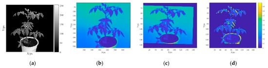 Figure 1b–d shows a representative spectral image taken by the SOC710 hyperspectral imager (using 466.93 nm as an example) and RGB and depth images obtained by the Kinect sensor. The multiview images collected by the SOC710 hyperspectral imager and the Kinect sensor were used to reconstruct the multispectral 3D point cloud model of the tomato plants using a multispectral 3D reconstruction algorithm.