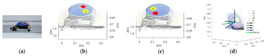 Figure 4a presents the electric rotary table used in this study, which had two circular calibration stickers (yellow and red, both 5 cm in diameter) on its round, blue surface. The Kinect pose estimation and self-calibration process was as follows. First, the RGB-D images of the rotary table were obtained and converted into 3D point clouds. According to the color threshold of the point clouds, the point cloud coordinates of the areas covered by the two calibration stickers were identified and the point cloud coordinates of the center of each sticker were calculated. Figure 4b demonstrates the coordinates of the two sticker centers, with Y1 representing the yellow sticker and R1 representing the red sticker, when the rotatory table was rotated by 0°. Similarly, Figure 4c shows the coordinates of the two sticker centers (Y2 and R2) when the rotatory table was rotated by 180°. Subsequently, according to the center coordinates of the calibration stickers in the two RGB-D images, the coordinates of the center M for the rotation axis of the rotary table were obtained. Finally, according to the coordinates of the calibration sticker centers in the two RGB-D images and the center coordinates M (a0, b0, c0) of the rotation axis, the normal vector P of the rotation axis of the rotary table was calculated and normalized to P (a, b, and c) (Figure 4d).