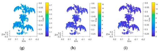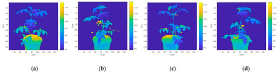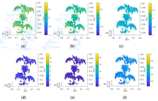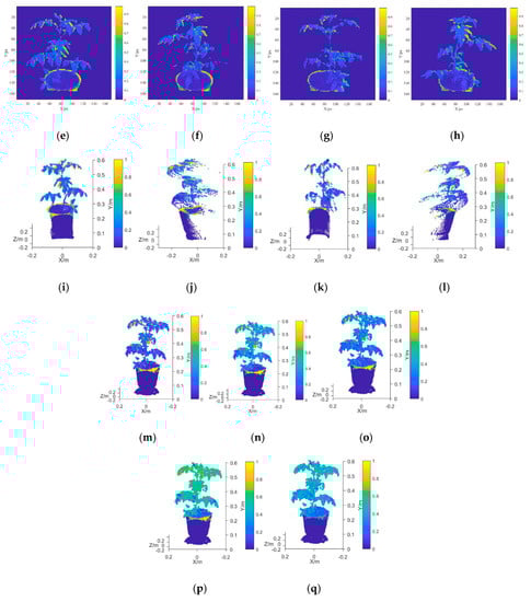 From the determined ROI range, the tomato plant area was identified and the background area was considered “not a number” (NaN). Figure 5a–d shows the depth images at AOV1, AOV2, AOV3, and AOV4, respectively. The spectral reflectance registration procedures described in Section 2.3.1 were used to register all the multispectral reflectance images at different AOVs in depth image coordinate systems. Figure 5e–h shows the spectral reflectance for the AOV1, AOV2, AOV3, and AOV4 images after the registration, respectively (with ρBlue as an example). The RGB-D image 3D reconstruction method described in Section 2.3.2 was used to convert the depth images at all the AOVs into point cloud images. Their multispectral reflectance values were ρBlue, ρGreen, ρRed, ρRed-edge, and ρNir. Figure 5i–l presents the 3D point clouds for the AOV1, AOV2, AOV3, and AOV4 images with the unified coordinate system (with ρBlue as an example). As a result of the morphological complexity of the plant canopy and the shielding effect of the leaves, it is impossible to establish a complete plant point cloud model from a single AOV; hence, it is necessary to integrate multiview point cloud models. In this study, the 3D point cloud models of the tomato plants at the four AOVs were obtained and used to reconstruct a multispectral 3D point cloud image through precise ICP registration. Figure 5m–q presents the 3D point cloud models of ρBlue, ρGreen, ρRed, ρRed-edge, and ρNir.