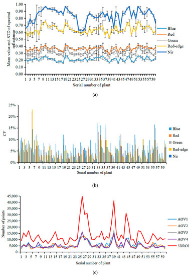 In this study, the center coordinates of the rotation axis for the electric rotary table were (0, 0, 0) and the 3D point clouds of the plant canopy area were identified according to the height of the pot. The mean value, standard deviation (STD), and coefficient of variation (CV) of the spectral reflectance for the AOV1, AOV2, AOV3, AOV4, and canopy 3DROI point cloud models of 60 tomato plants in the Blue, Green, Red, Red-edge, and Nir characteristic wavebands were calculated (Figure 6a,b). In addition, the numbers of points in the AOV1, AOV2, AOV3, AOV4, and 3DROI canopy models were counted (Figure 6c).