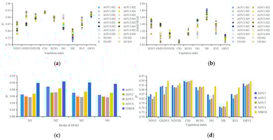 Figure 8a,b shows the R2 and RMSE values of the 180 regression models that were established using the SPAD value and nine vegetation indexes (NDVI, GNDVI, NDVIR, CIG, RCIG, NG, NR, RVI, and GRVI) from the AOV1, AOV2, AOV3, AOV4, and 3DROI point cloud models. The R2 and the RMSE values ranged from 0.7279 to 0.9443 and from 0.8505 to 1.8471, respectively.