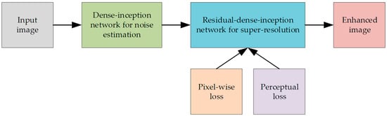 As shown in Figure 6, a novel network, the so-called residual-dense-inception network, is proposed to recover the image from low-resolution, noisy, and blurred interruption. It mainly consists of four different parts, including the pre-processing module, residual-dense-inception module, sub-pixel convolution module, and reconstruction module. We will introduce them in detail as follows.