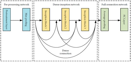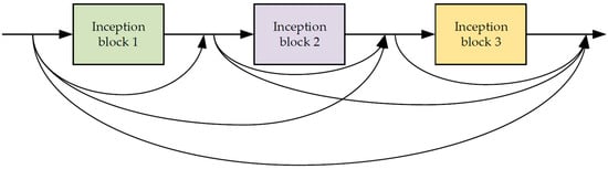 As shown in Figure 4, the three inception-residual modules are connected in the dense manner. Assuming the output of layer, , is , the relationship between them can be represented as follows: